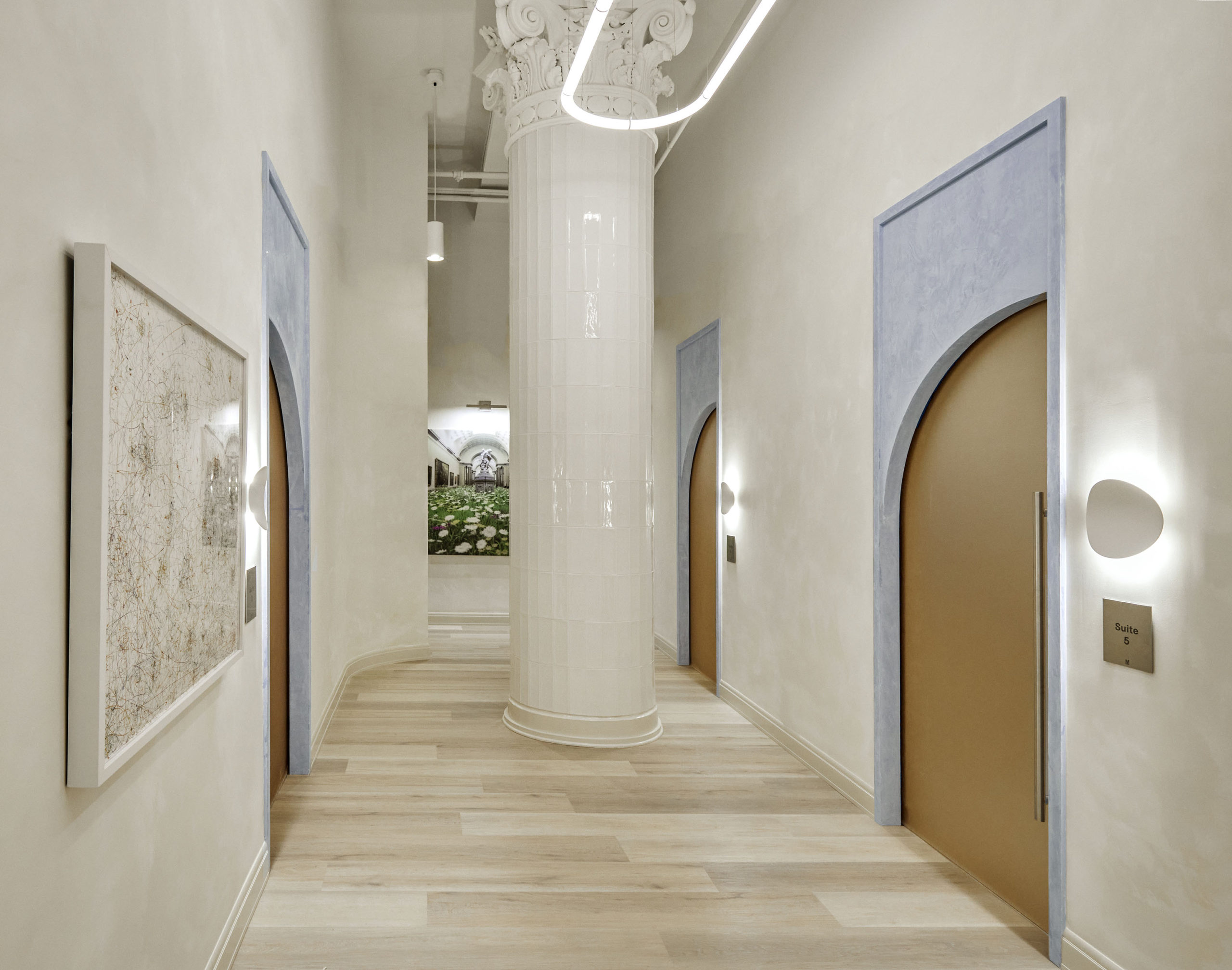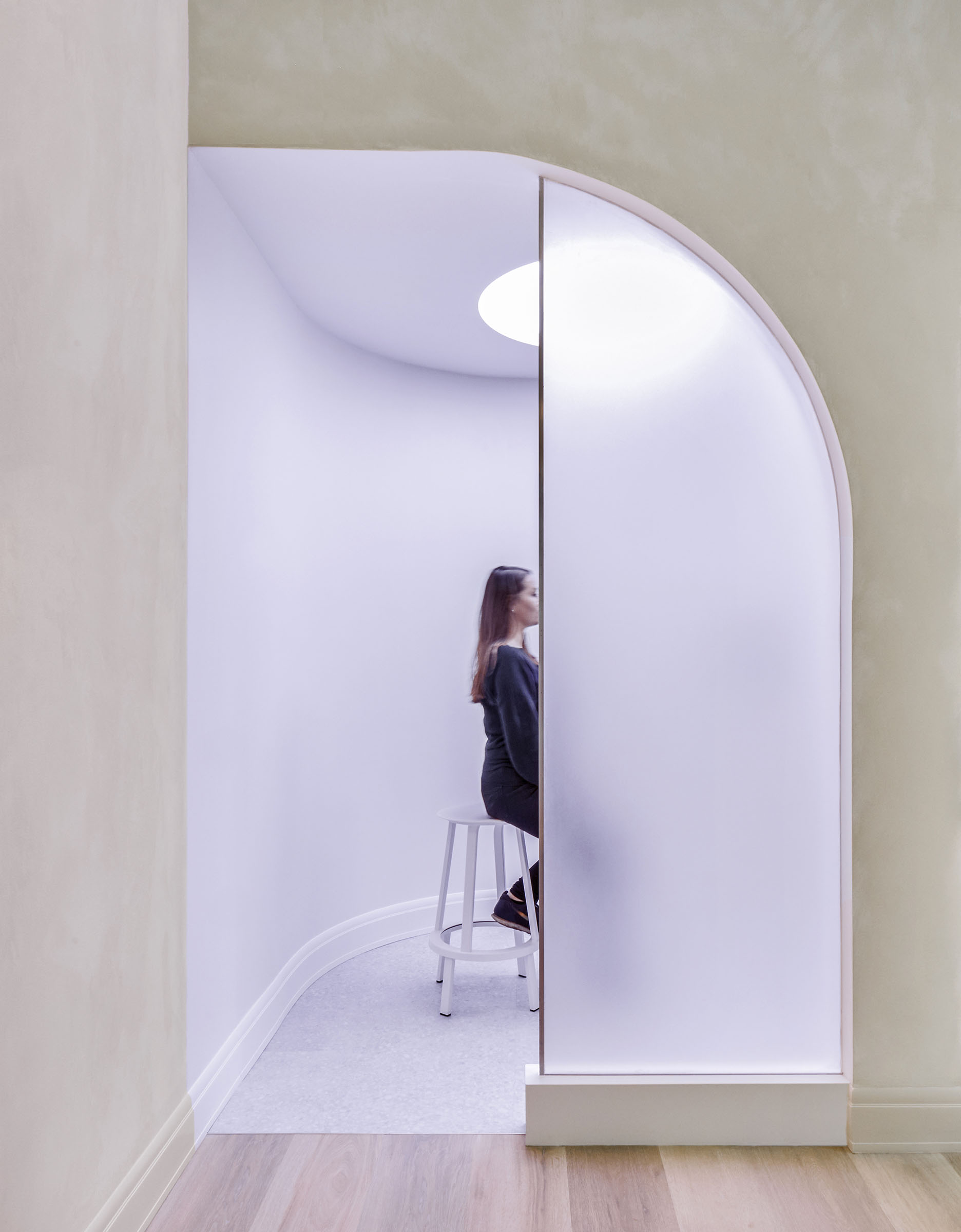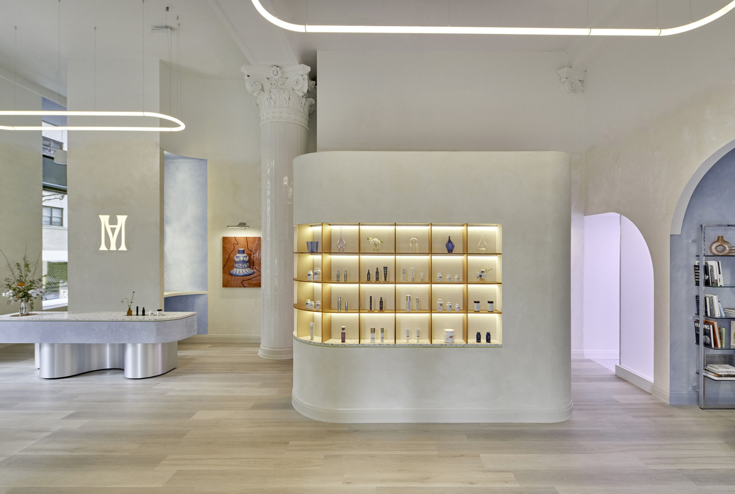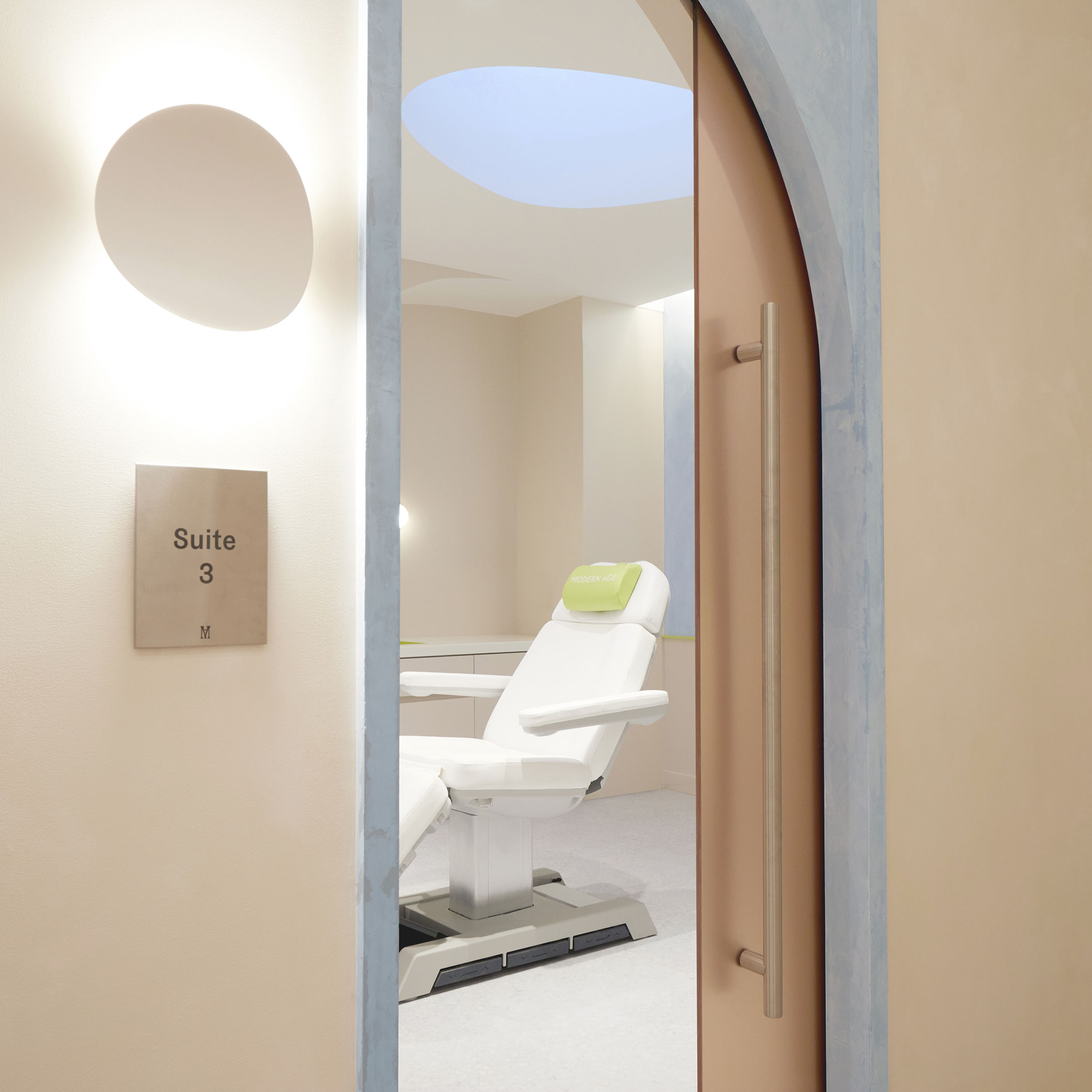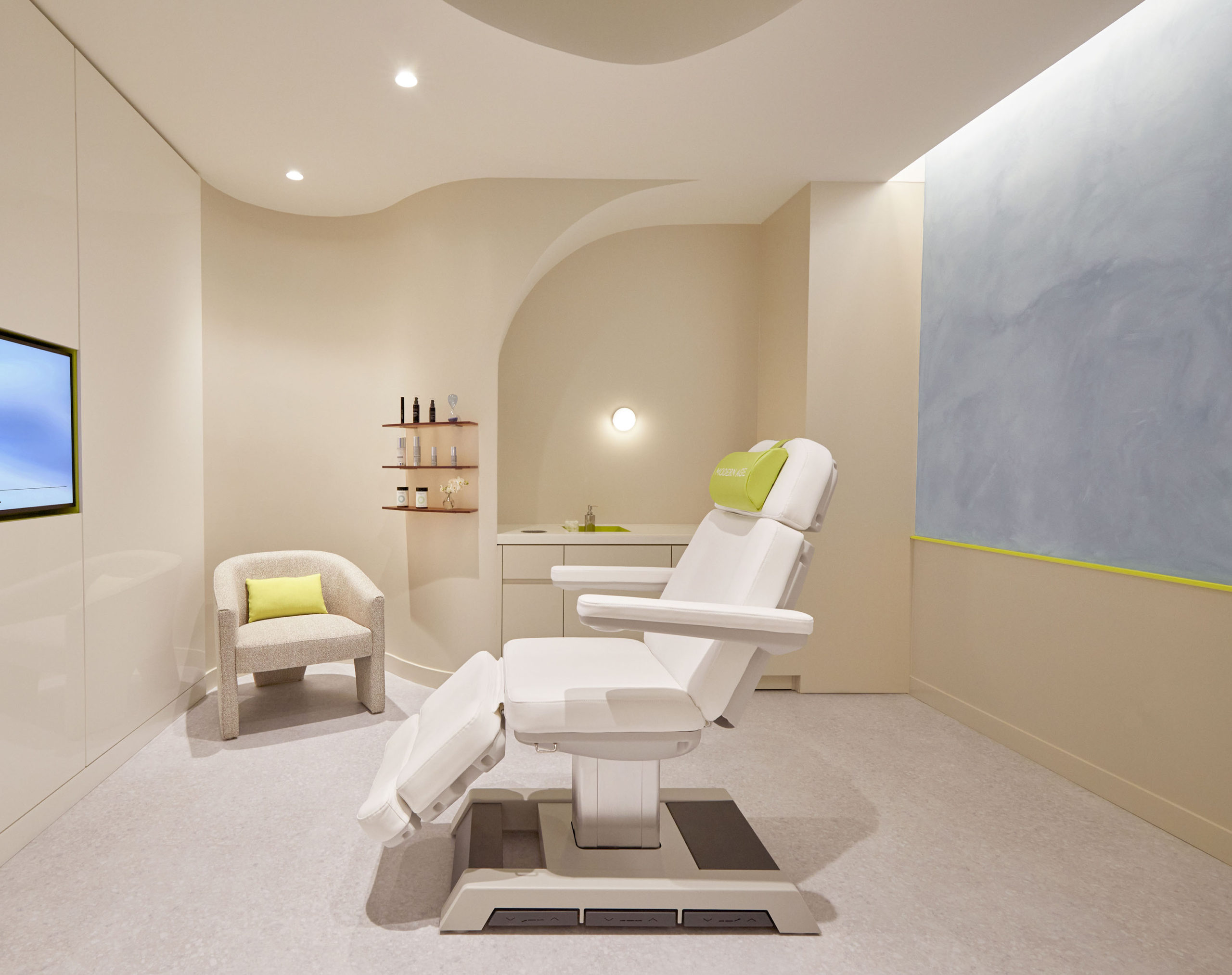 Modern Age is an aging wellness destination, founded with the mission to holistically bolster each client’s subjective age through targeted treatments and products. The flagship studio, inspired by the human body, gives acute attention to the visitor journey through spatial, tonal, and surface cues. Sculptural window displays provide a cheery first impression. Once inside, color and form provide competing cues, balancing lux spa with clinical office. A custom biomorphic curved reception desk, with a floating stainless steel base, an earthy lime washed plinth, and an aggregate countertop sets the tone, aptly balancing luxury recreation and medical precision. Progressing from reception to treatment rooms, visitors move from the earthen lime to highly polished tile. Arched doorways; organic, rounded faux skylights; natural stone; and ornamental light fixtures are reminders to relax and enjoy. While the reductive color and secondary material palettes—centered on blue, chartreuse, and peach and stainless steel, smooth vinyl, and high-polish gloss—lend clinical credo to the medical professionals charged with diagnosis and treatment.