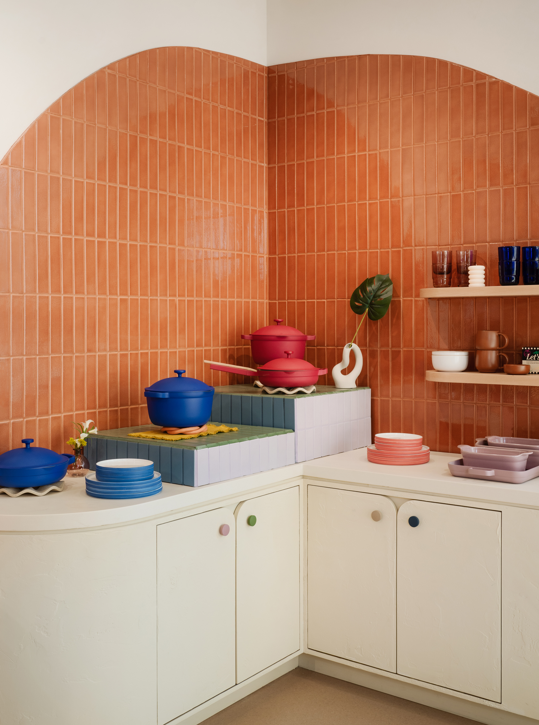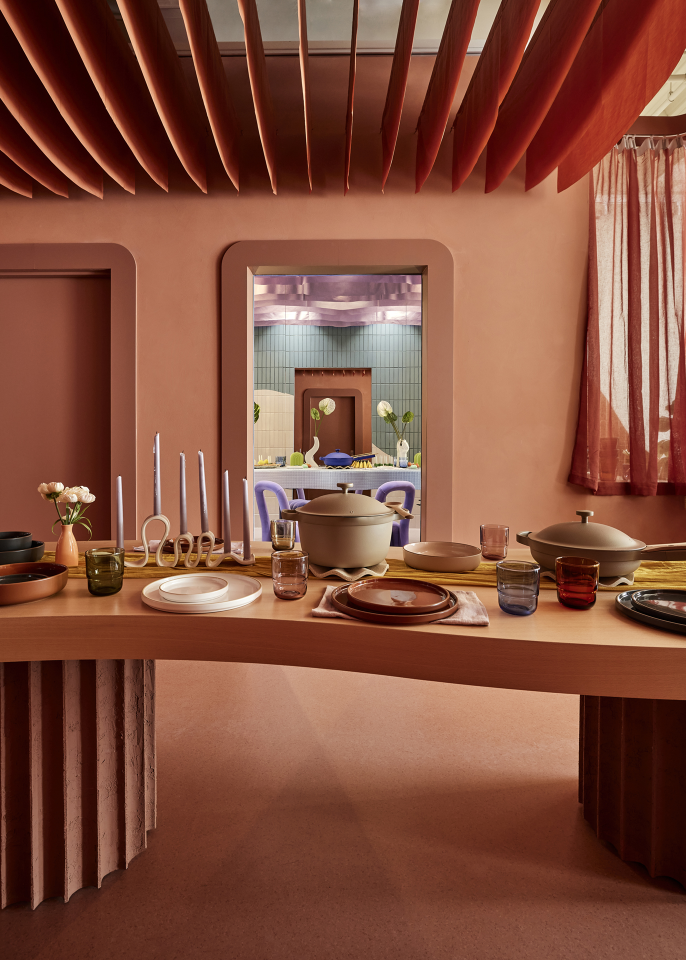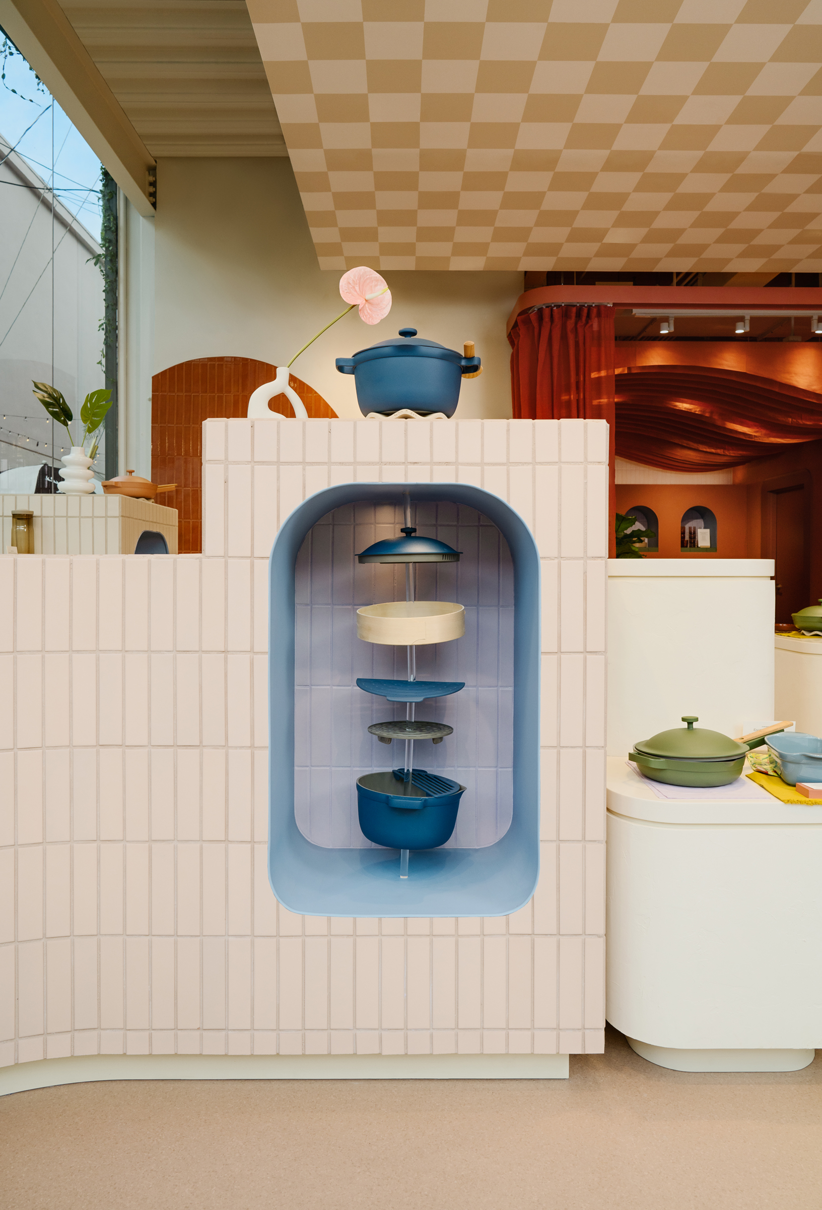 Like an aesthete’s apartment, the store is compartmentalized into an intimate series of rooms. The brand personified, the home answers the merchandise, at once echoing the brand—as in the ceiling checkerboard mural, a distillation of iconic campaign and product imagery—and becoming a neutral foil for the brand’s eccentricities. Each domestic experience heightens the next, discovery augmenting discovery. In one vignette, warm terracottas and creamy sand tones provide a neutral backdrop for colorful merchandise. Large waves sweep across limewashed walls. Terraced displays showcase the many shades of the Brand’s expanding cookware line. Smooth, ceramic tiles in jewel-tone hues—sapphire, emerald and amethyst—neighbor rutted plaster display fixtures. Sheer linen curtains and diaphanous textiles, suspended from the ceiling, are answered by a heavy, sculpted dining room table.