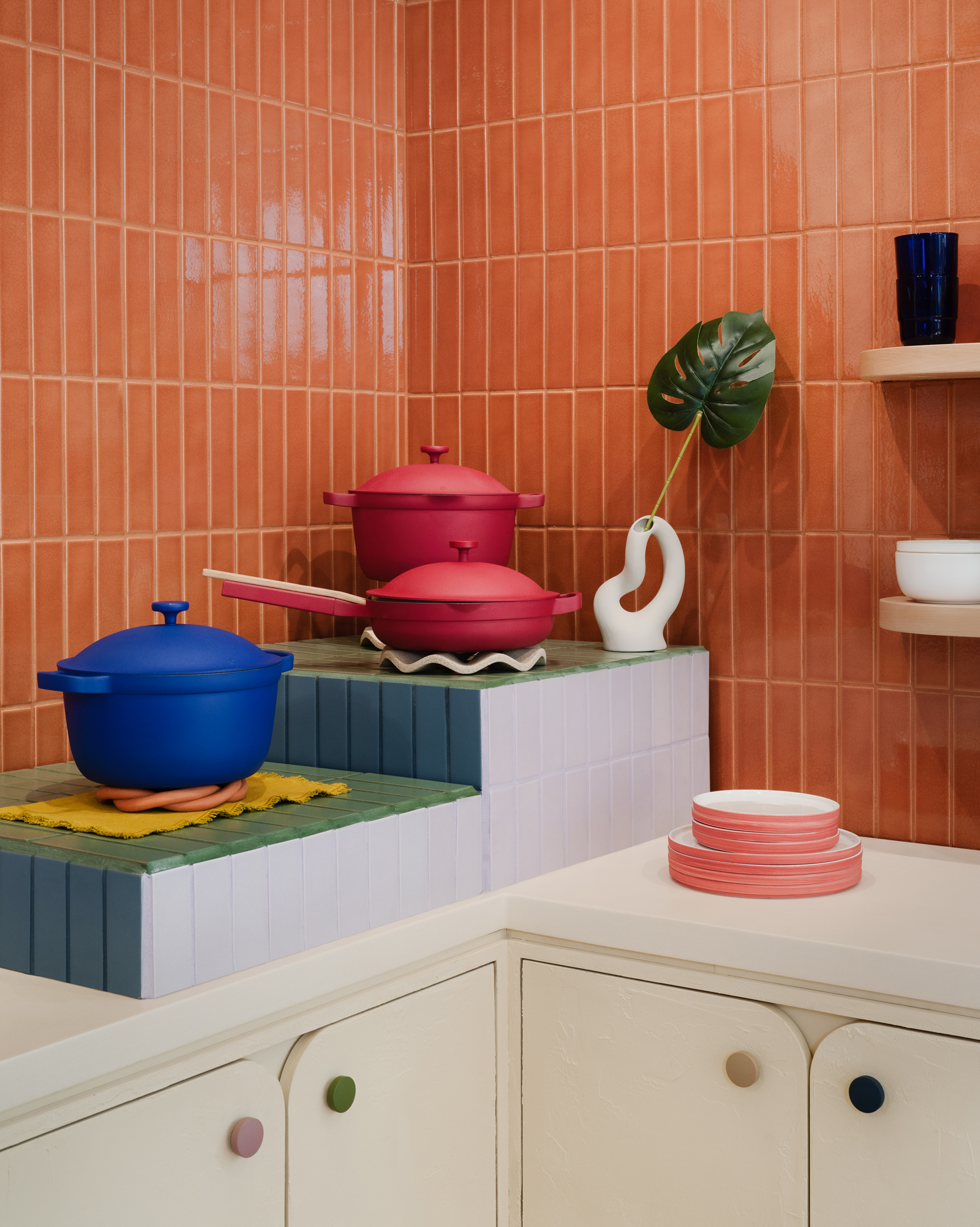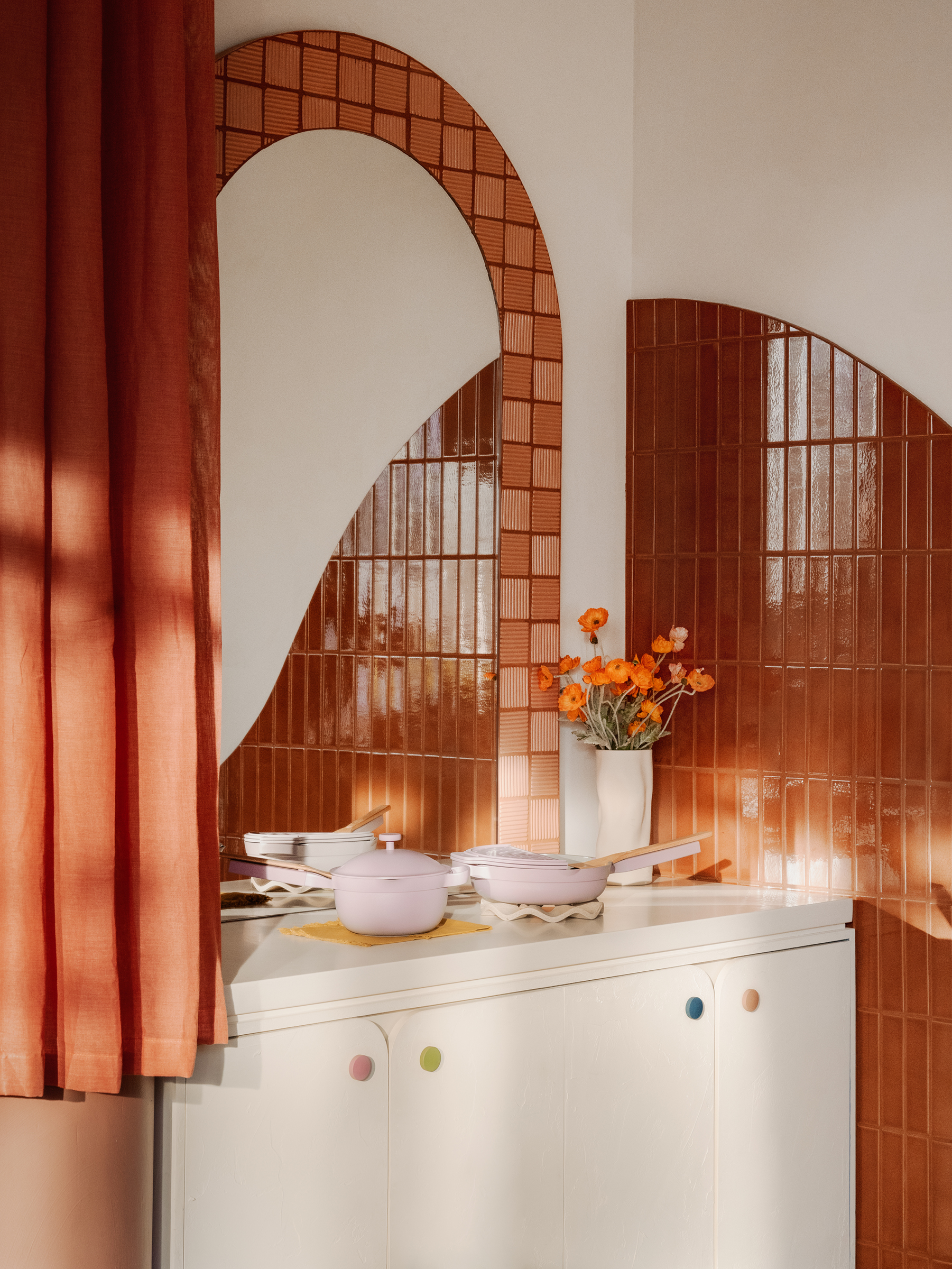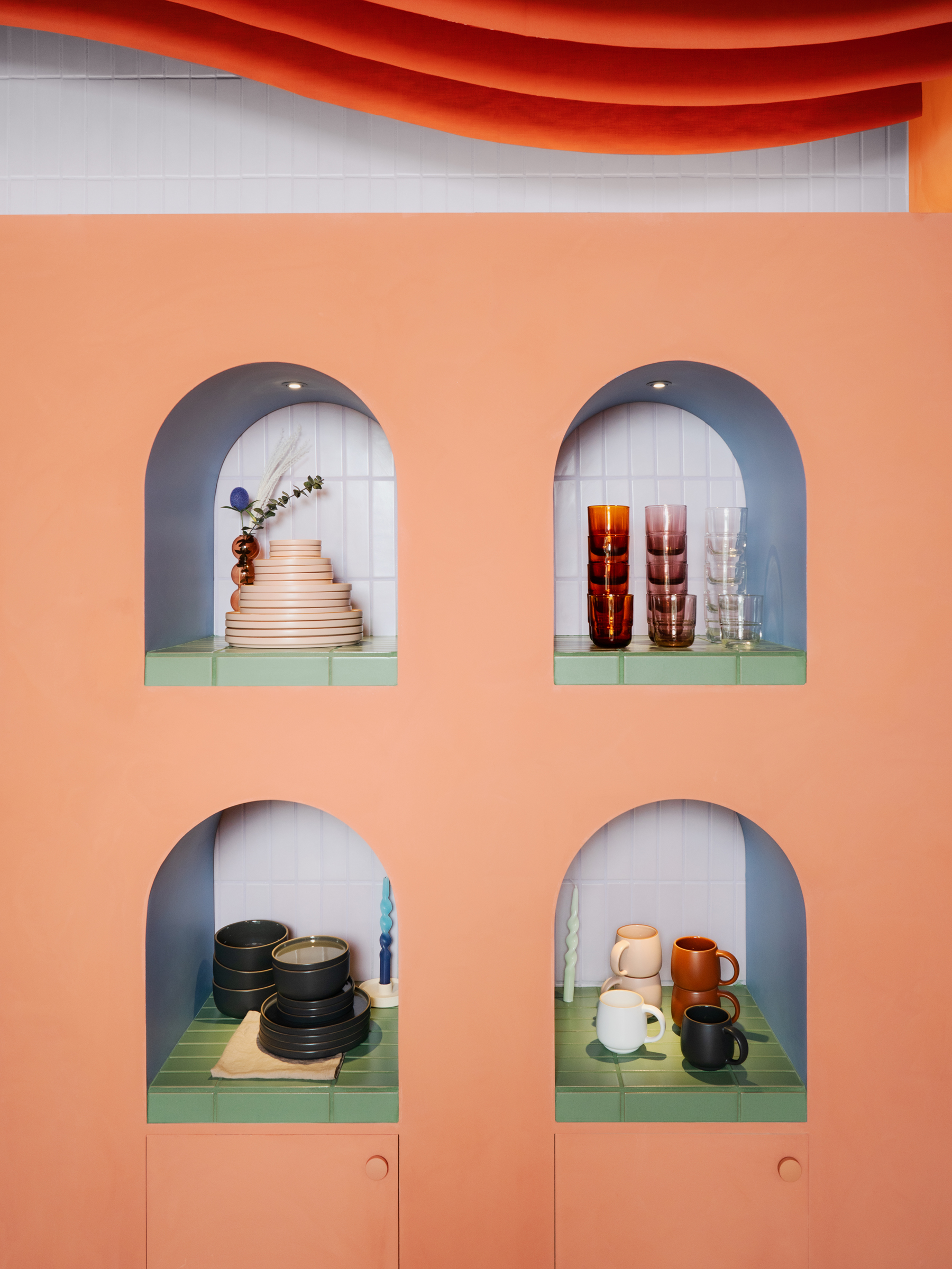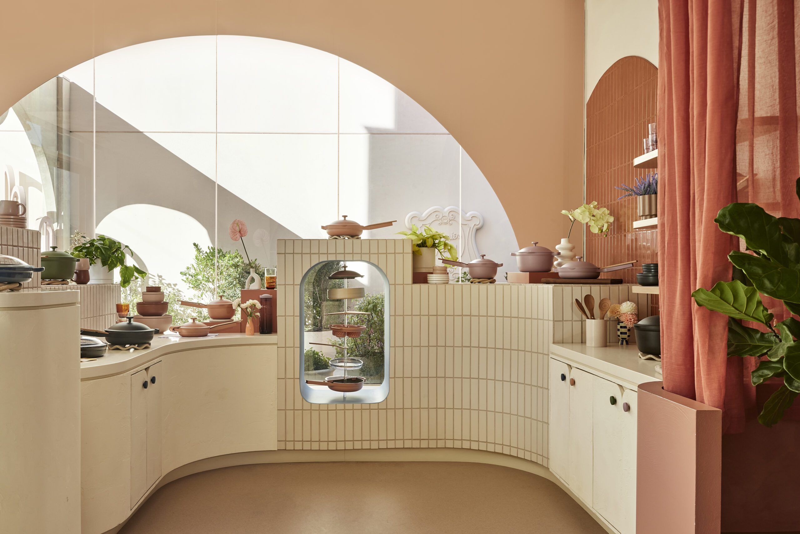 Like an aesthete’s apartment, the store is compartmentalized into an intimate series of rooms. The brand personified, the home answers the merchandise, at once echoing the brand—as in the ceiling checkerboard mural, a distillation of iconic campaign and product imagery—and becoming a neutral foil for the brand’s eccentricities. Each domestic experience heightens the next, discovery augmenting discovery. In one vignette, warm terracottas and creamy sand tones provide a neutral backdrop for colorful merchandise. Large waves sweep across limewashed walls. Terraced displays showcase the many shades of the Brand’s expanding cookware line. Smooth, ceramic tiles in jewel-tone hues—sapphire, emerald and amethyst—neighbor rutted plaster display fixtures. Sheer linen curtains and diaphanous textiles, suspended from the ceiling, are answered by a heavy, sculpted dining room table.