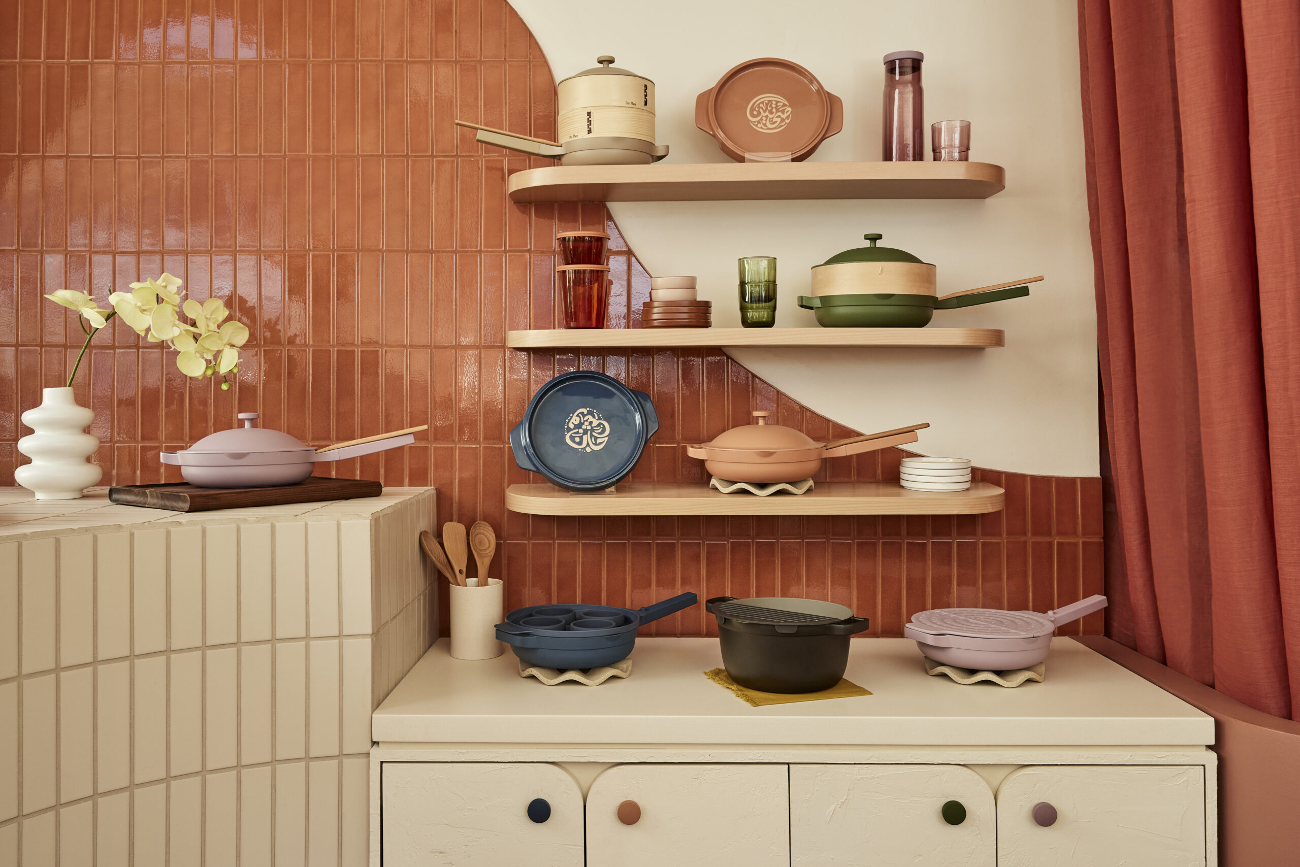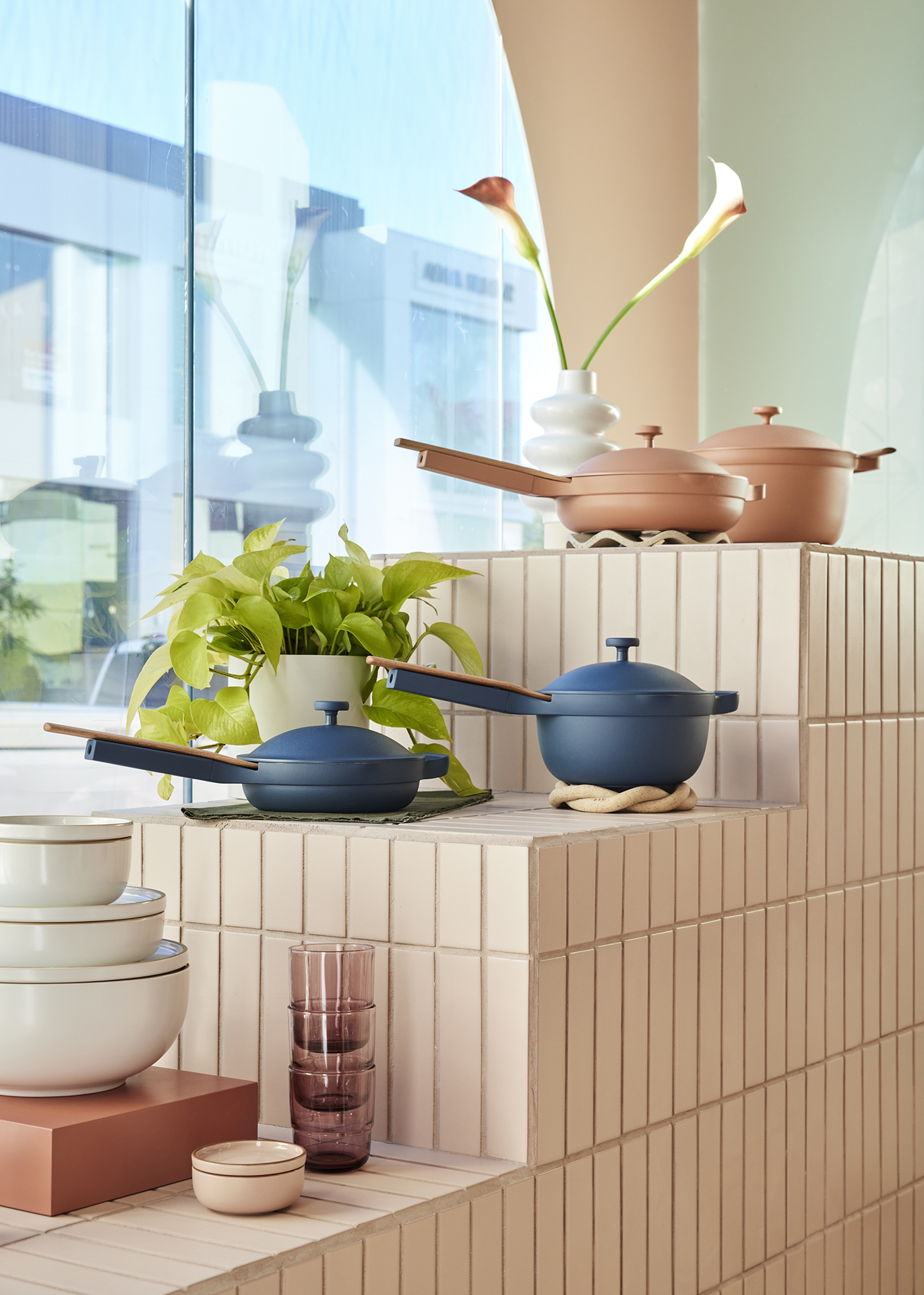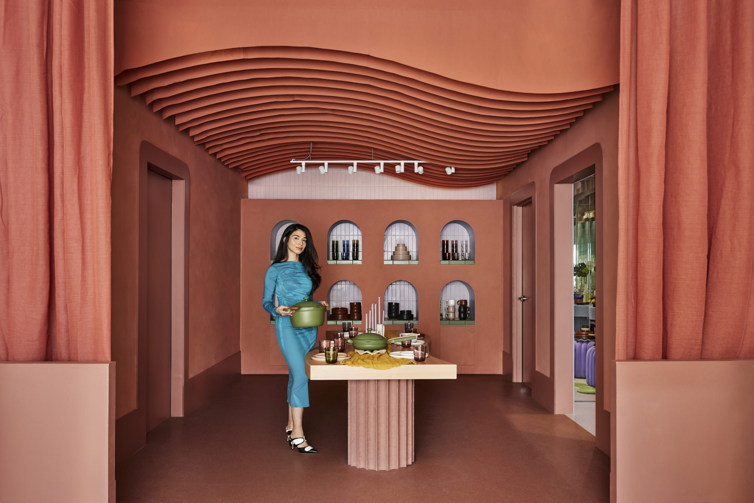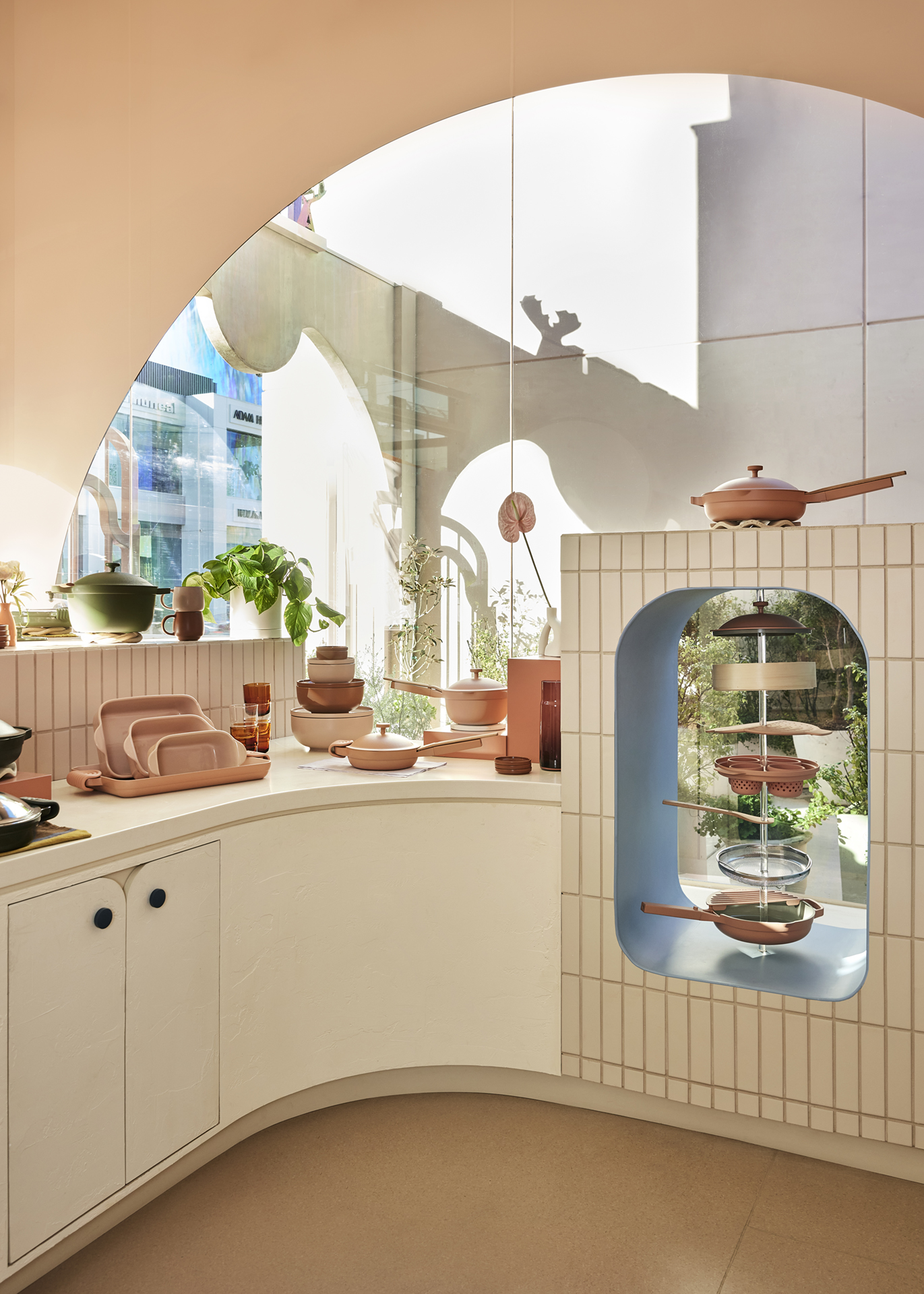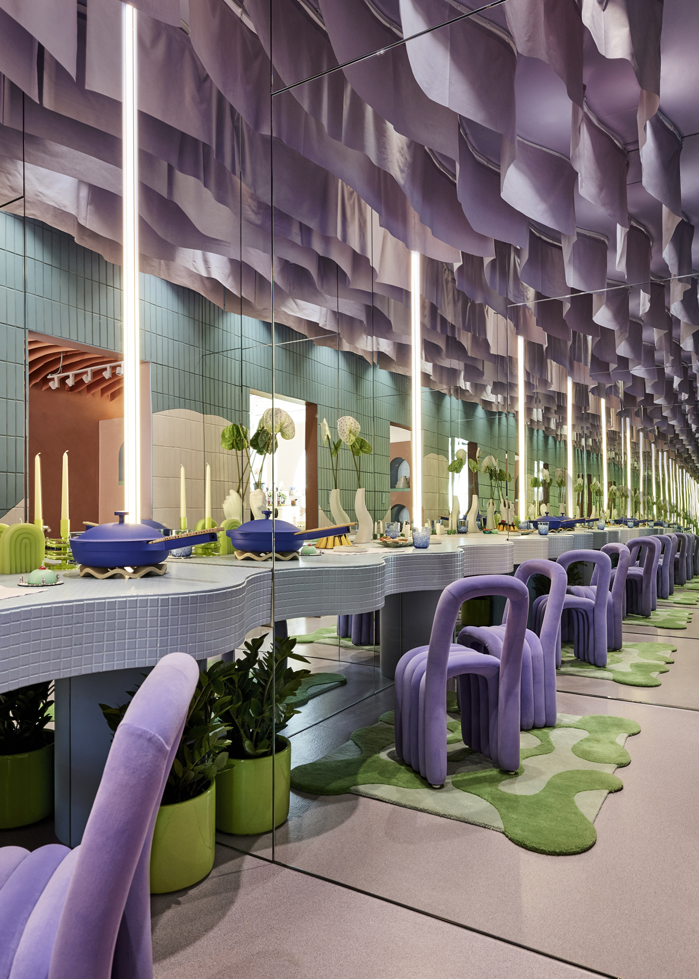 Playful surprises abound – colorful cabinet knobs are actually the brand’s distinctive pan lids. Glowing arched niches feature still lives composed of best sellers. A final surprise: the Small Room of Wonders designed with lavender tiles and floor-to-ceiling mirrors to create the illusion of a never-ending dining table. The brand’s mission of “Building a bigger table” is realized, aptly merchandised for an iconic instagram photo. A retail landmark.