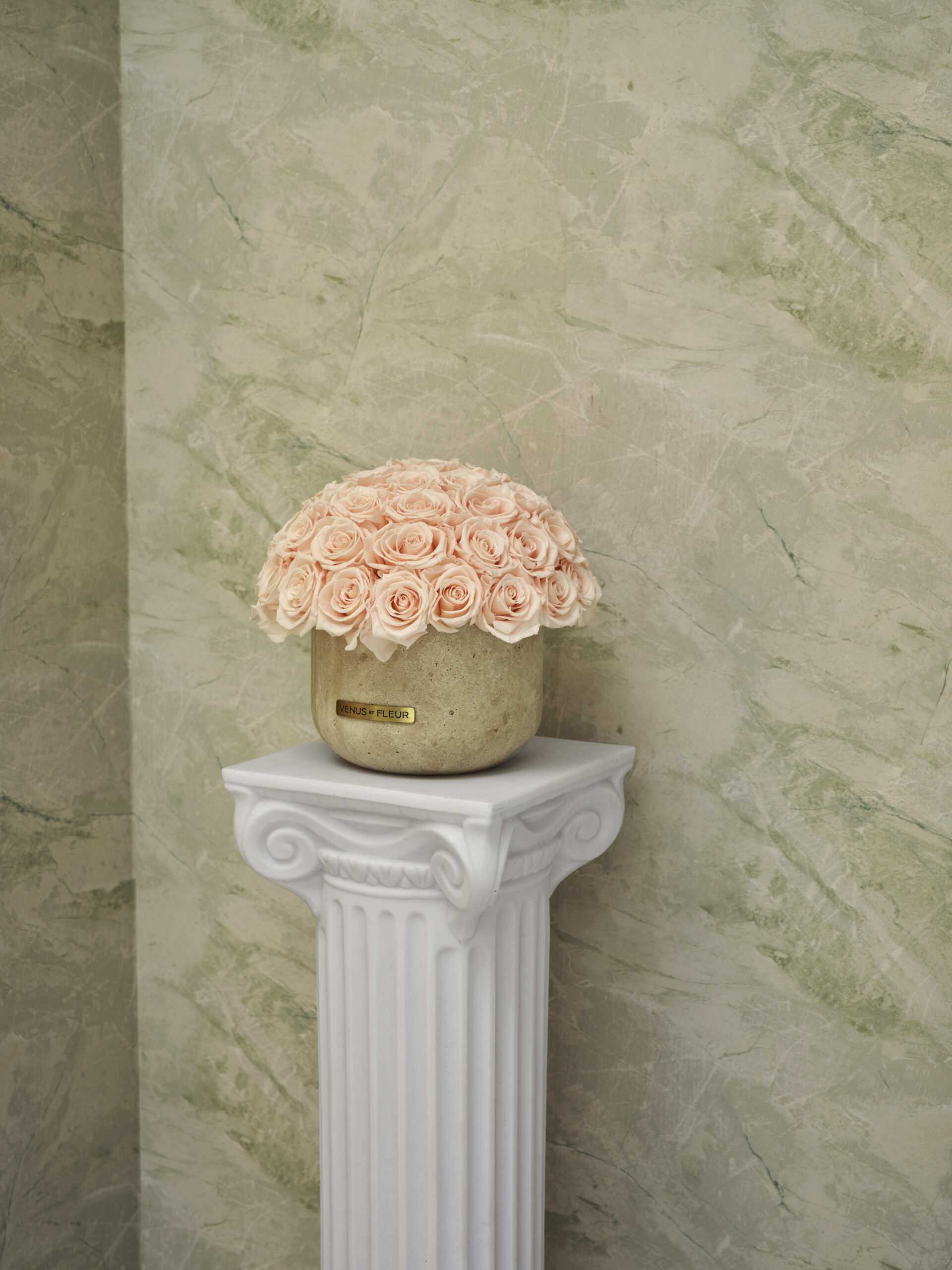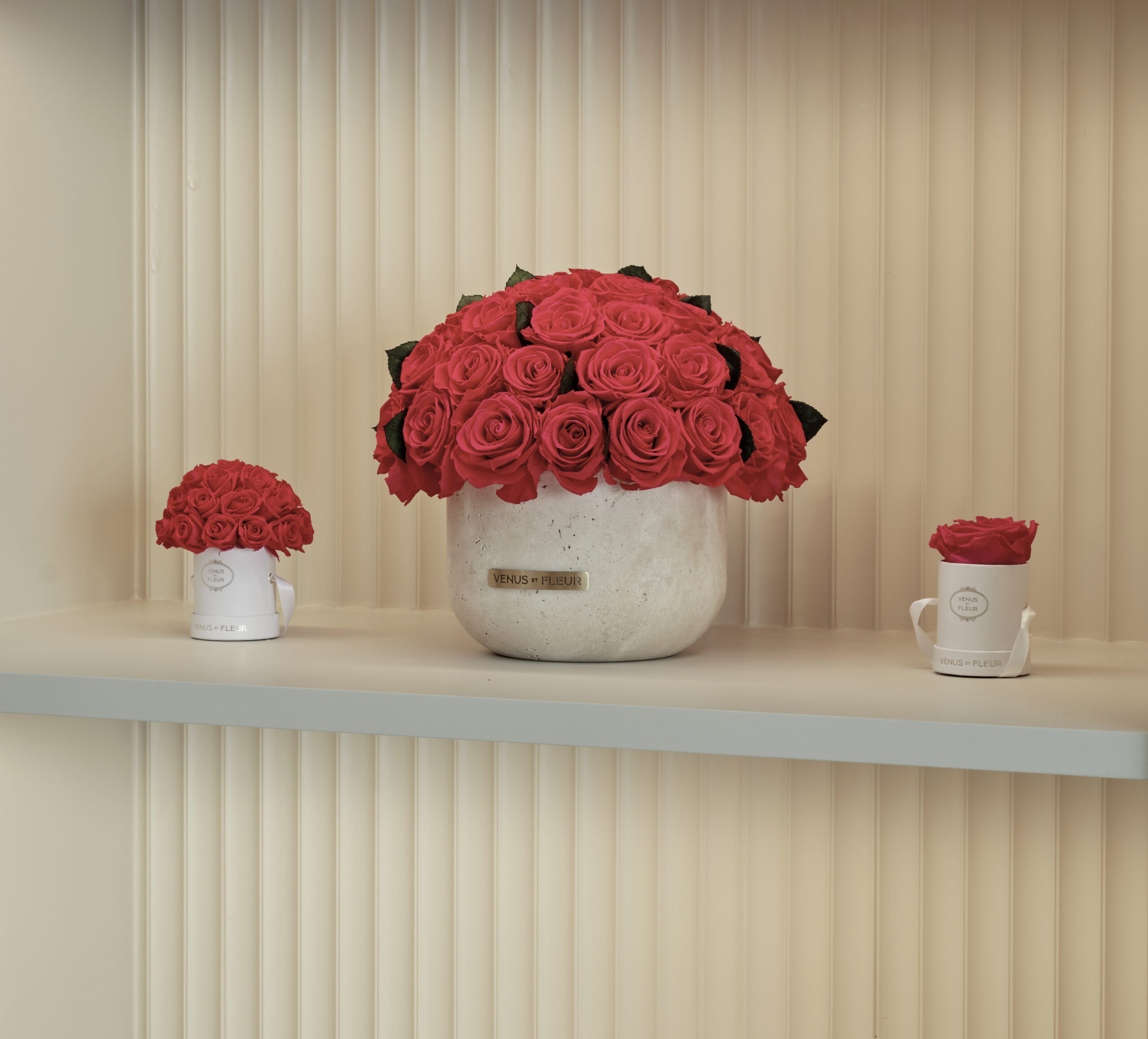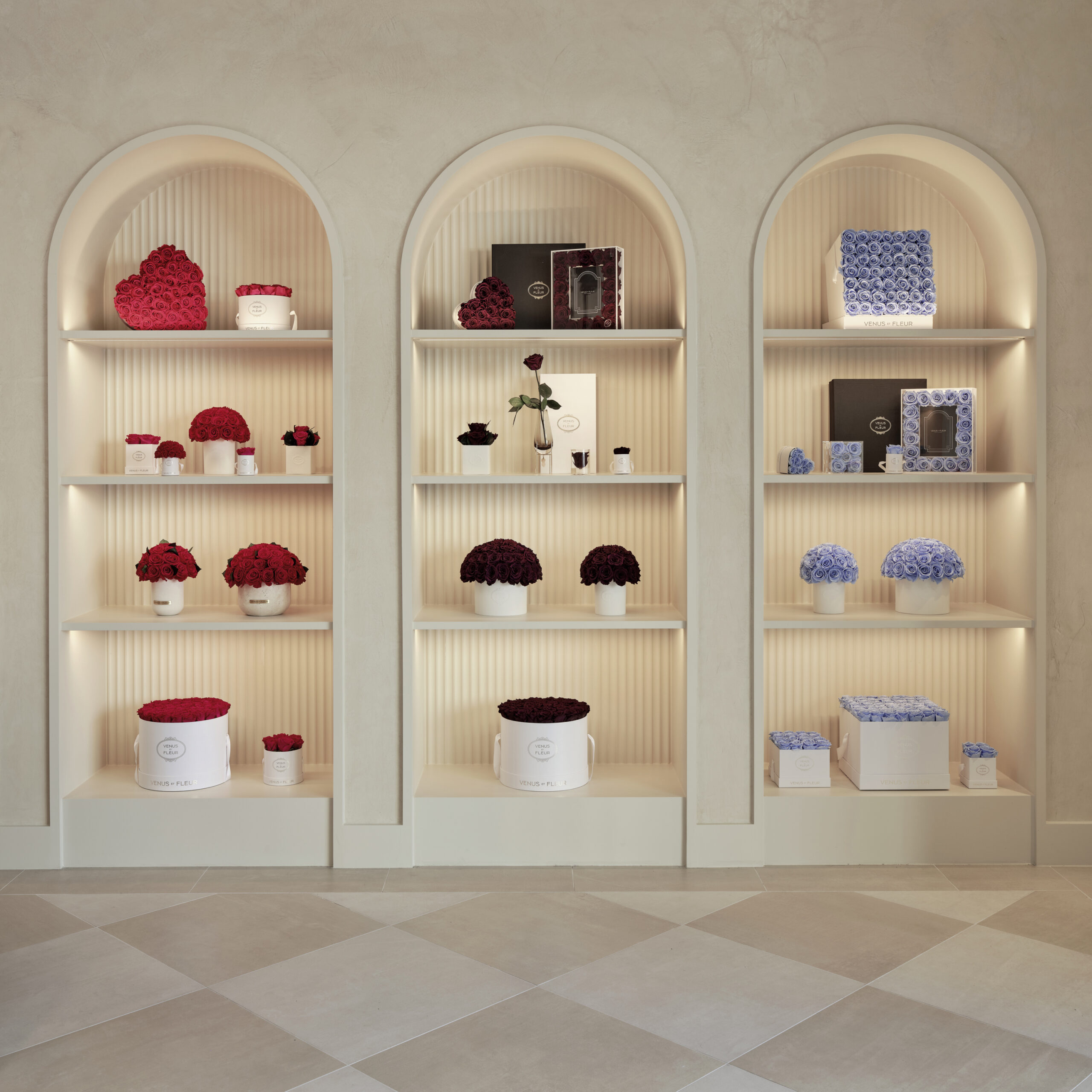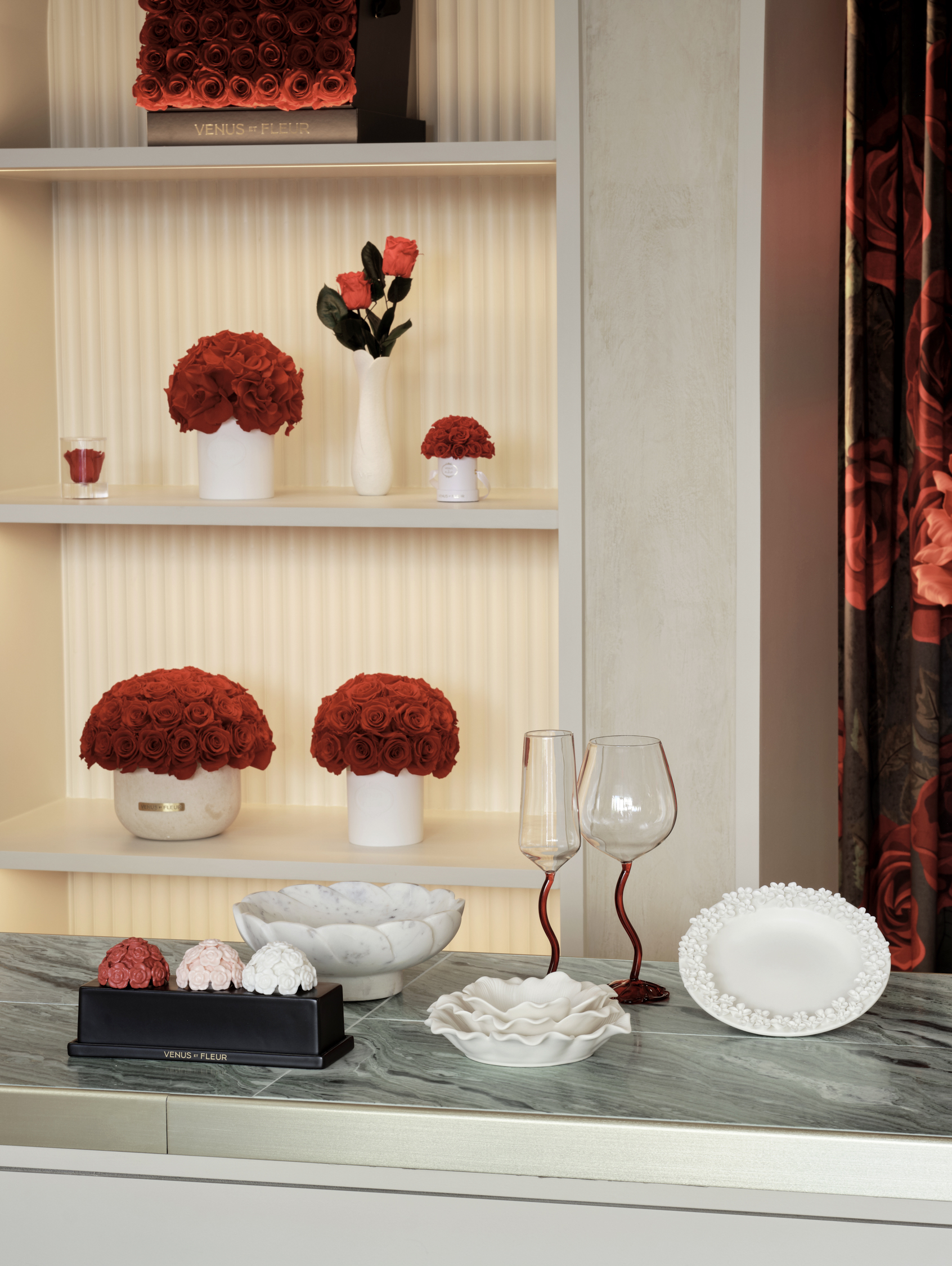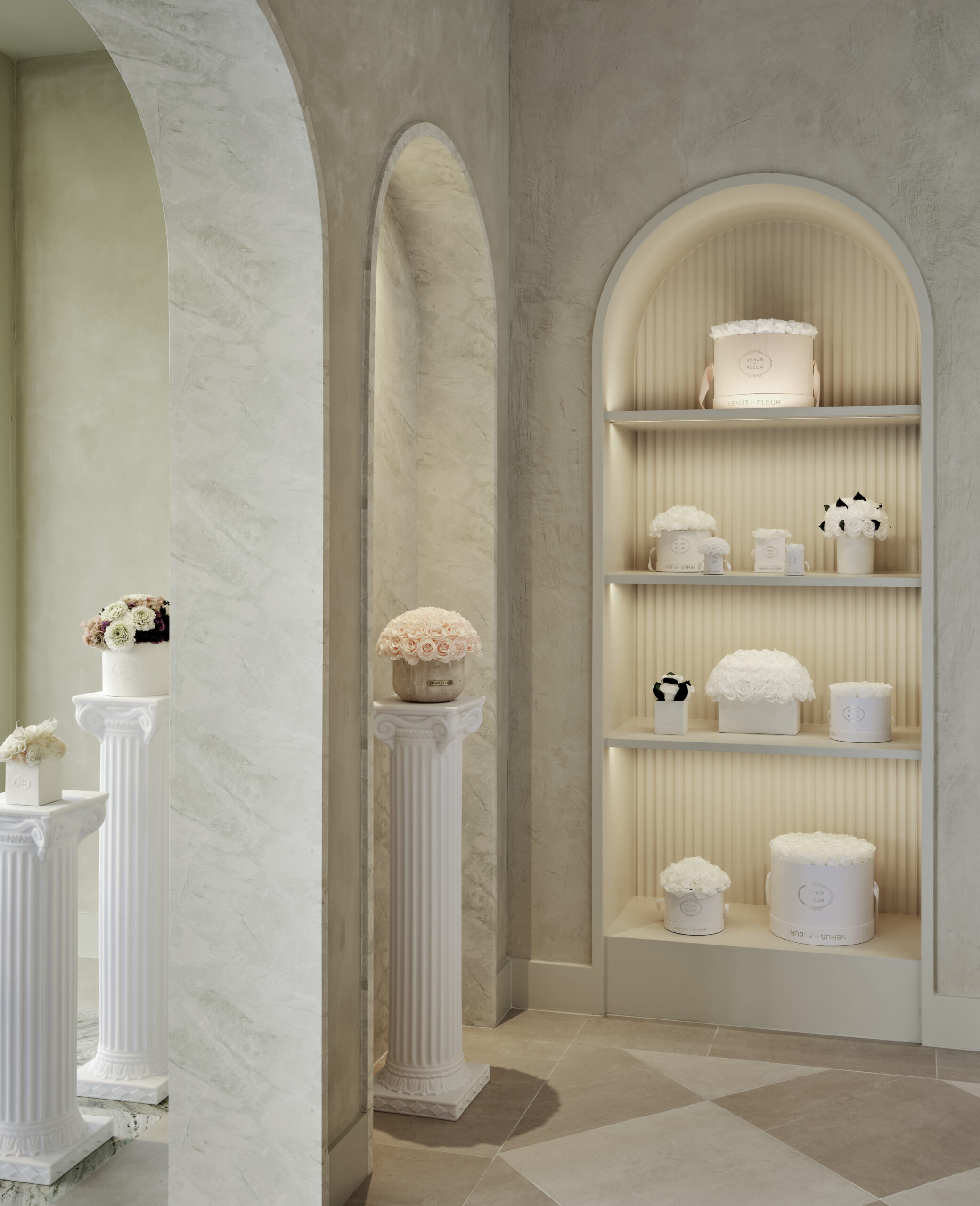 The entrance, adorned with a pistachio limewash, acts as a gateway into the brand’s universe, creating a sense of anticipation as it frames the main retail floor. The central space is surrounded by arched niches, echoing the rhythmic cadence of a serene cloister, displaying the brand’s exquisite collection of florals and vessels in an array of hues. The journey culminates in a captivating moment at the back of the store: a content room where larger-than-life floral sculptures and custom rose-patterned curtains immerse visitors in the world of Venus et Fleur, evoking the enchanting ambiance of a romantic, oversized rose garden.